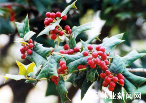 枸骨也稱鳥不宿、老虎刺、貓兒刺,因在歐美國家常用于圣誕節的裝飾美化,故亦稱“圣誕冬青”、“圣誕樹”。其葉形奇特,色澤濃綠光亮,四季常青,在秋冬季節紅色果實珠圓玉潤、鮮艷欲滴,是既可觀葉,又能觀果的優良樹種。可做不同規格的盆栽,布置廳堂、居室、門廊等處,端莊大氣,裝飾效果很好。又因其根干虬曲蒼勁,枝葉稠密,還是制作盆景的好樹種。枸骨耐寒冷,栽植于小庭院或用于園林綠化植物,也有不俗的表現。此外, 枸骨的枝條還是插花中常用的材料。近年還有人將枸骨中的無刺枸骨加工制作成塔形,其鮮紅的果實與翠綠的葉片相映成趣,商家謂之“滿堂紅”,非常吸引人。 ![]() 葉奇果艷的圣誕冬青——枸骨 枸骨為冬青科冬青屬常綠灌木或小喬木,株高3米至4米。樹皮呈灰白色、光滑,葉片硬革質,長圓狀四方形,頂端有硬而尖的刺齒3個,兩側也各有同樣的刺齒1至2個,新葉在陽光充足的環境中為紅褐色,以后葉面逐漸轉為濃綠色,有光澤,背面則為淡綠色。小花黃綠色,4至5月開放。核果球形,直徑8毫米至10毫米,9月成熟后呈鮮紅色,經冬不落,至次年的2至3月才陸續脫落。栽培中另有葉片長橢圓形無堅硬刺齒的無刺枸骨、葉片細小而稠密的小葉枸骨、果實呈黃色的黃果枸骨等品種。 枸骨原產我國黃河以南的部分省區,朝鮮半島也有分布。喜溫暖濕潤和陽光充足的環境,耐半陰,有一定的耐寒能力。適宜在排水良好的肥沃、微酸性土壤中生長。一般在春季移栽,由于須根少,移栽時應帶土團,如果土團碎了或根系受到損傷,可剪去部分枝葉,以減少水分蒸發,保證成活。地栽植株平時管理較為簡單,天旱時注意澆水,入冬前開溝施一次腐熟的餅肥,然后澆足水。冬季移至0℃以上的室內越冬。每2至3年換盆一次,盆土可用腐葉土2份、園土2份、沙土1份的混合土,并摻入少量的動物蹄角或餅肥作基肥。若不換土,可在早春萌芽前將腐熟的餅肥末均勻地撒在盆土表面,然后用小鏟翻入土中,并澆一次透水。枸骨的繁殖常用播種、扦插、分株的方法。