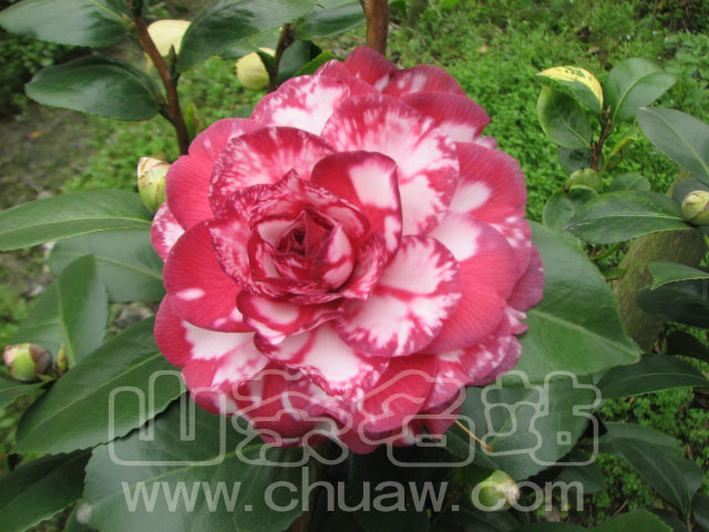 新品種:美國牛西奧苗圃新近公布的新品種貝拉大玫瑰的突變種。深紅色帶白色斑塊,花瓣覆瓦壯排列,完全重瓣型,巨型花;濃綠,幼葉泛紅色,寬大;長勢旺,開張;花期1---3月。