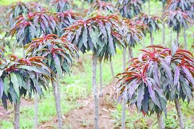 桃樹是我國北方地區(qū)園林綠化的重要樹種,桃花游已成為人們初春踏青的首選之一。而如今,這個家族又多了一位彩葉成員———紅葉壽星桃,它不僅可以賞花,其鮮亮的紅葉也十分惹眼。記者了解到,該樹種經(jīng)過5年的選育、栽培和試用,即將投放市場!斑@個樹種集觀葉、花、果、樹形于一身,適應性強、應用形式多樣,未來的市場前景不容小覷!辈稍L中,多位業(yè)內(nèi)人士如此評價。 紅葉壽星桃是壽星桃的一個變種,植株矮化、花芽密集。與普通壽星桃相比,紅葉壽星桃的葉子常年呈紫紅色、顏色鮮亮,葉片更為細長;開花繁茂、花更大,以復瓣居多,冠形飽滿,應用形式更為靈活,盆栽觀賞、低矮造型球、中高層列植做色帶等均可。 五年前,河南遂平縣玉山鎮(zhèn)名品花木園藝場場長王華明在苗圃中偶然發(fā)現(xiàn)了壽星桃的這一變種,經(jīng)過擴繁,如今紅葉壽星桃在數(shù)量及規(guī)格上已初具規(guī)模。說起這一樹種,王華明列舉了它的三個優(yōu)勢。 首先,紅葉壽星桃觀賞性強,紅葉期長。在整個生長季節(jié)內(nèi),其葉片均呈亮紫紅色,葉片稠密,株形緊湊,整株色感表現(xiàn)極好。 其次,適應性強,既耐高溫、又耐寒冷。紅葉壽星桃在冬季不低于-23℃就不會發(fā)生凍害。喜干燥環(huán)境、喜光,耐旱性極強,適宜于排水良好的壤土中生長,也稍耐鹽堿和黏重土壤,但不耐水澇。 再次,嫁接成活率高、成型快。紅葉壽星桃的繁殖以嫁接為主。嫁接多用切接或盾形芽接,春夏秋三季均可嫁接。砧木可用毛桃,亦可用李、杏、梅等。切接在春季芽萌動時進行,芽接于8月上旬至9月上旬進行。該樹種一般不需要整形修剪也能保持良好的冠形,只要在花后注意剪除干枯死枝,適當疏枝即可。嫁接苗1至3年就能開花結果,4至8年即進入花果盛期。 由于優(yōu)點突出,紅葉壽星桃還在苗圃繁育階段就被不少生產(chǎn)商和苗木經(jīng)紀人瞄上,目前在河南、四川等地有小范圍應用,適應性和景觀表現(xiàn)良好。談及應用前景,王華明表示,壽星桃是桃中最適宜于盆栽的品種之一,而紅葉壽星桃更因葉色紅艷喜人,開花繁茂艷麗,在盆栽領域大有作為,可制作成中型或微型盆景。 另外,紅葉壽星桃的傘狀冠十分緊實,可以低接做成色球,亦可高接在園林造景中作為中高位色帶。“三年生低接紅葉壽星桃的冠幅能達到80厘米,整株高度在1米左右!蓖跞A明說,目前他的苗圃里各種高接、低接的紅葉壽星桃有上萬株,今秋或者明春將正式推向市場。王華明已向國家林業(yè)局提出植物新品種保護申請。另據(jù)業(yè)內(nèi)人士反映,由于該樹種目前的生產(chǎn)量較小,價格較高,對大范圍推廣形成一定障礙,隨著市場量增價降,其推廣應用前景樂觀。