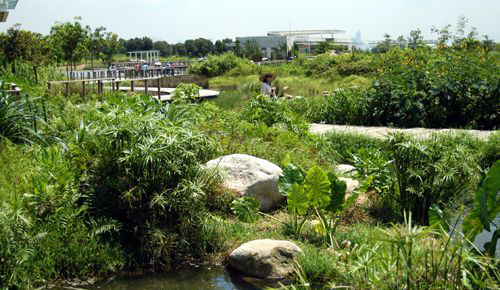 在景觀設計中,鄉土植物占主導地位,這樣不僅可以盡可能地模擬自然生境,而且能夠將維護成本和水資源的消耗降到最少。通過水系統的設計,使得來自于生態緩解區淡水湖的水,通過循環又回到湖中,從而減少了水資源的消耗。簡單的灌溉系統主要用來輔助植物景觀的建立和維護,而且僅在晚上使用,以降低蒸發和消耗,并保證不與游客發生沖突。戶外照明裝置僅限于入口廣場和建筑入口坡道,在濕地公園的大部分區域沒有照明設備以減少對野生生物的干擾和降低能源消耗。