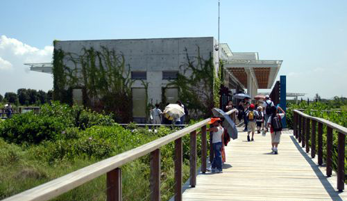 由于游客中心將成為最重要的旅游景點,因此它被刻意安排在接近入口和城市的位置。為了避免對棲息地不必要的侵擾,停車場和其它基礎設施的面積被有意地降至最小。游客中心后面會有一系列針對主題、傳達教育信息的展覽花園、展覽池塘和人造生境,一步一步的引領游客到分館的濕地探索中心或戶外教室,接著沿浮橋到達觀鳥屋,再前往較接近拉姆薩爾公約濕地的偏遠外圍生境。到這個范圍參觀的游客應會遠少于訪客中心。游客中心為了體現整體環境融入自然的思想,隱藏在人造山坡之下。不單如此,越深入公園,建筑物的高度和設施的密度就會越低,遠離城市越遠而與拉姆薩爾公約濕地越近,游人眼底盡是人造的天然生境。