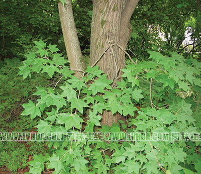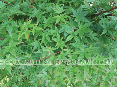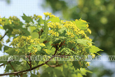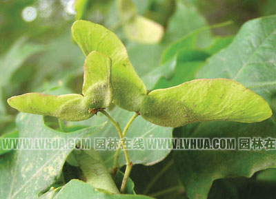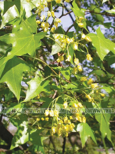 形態:落葉小喬木,高達8~13米;樹冠傘型或倒廣卵型。干皮灰黃色,淺縱裂;小枝淺土黃色(一年生枝嫩綠色),光滑無毛。葉為單葉對生,主脈5條,葉掌狀五裂,長5~10cm,有時中裂片又3裂,裂片先端漸尖,葉基通常截形,稀心形,兩面均無毛;葉柄細長。長3~5cm。花均為雜性,花黃綠色,徑約1cm,多成頂生傘房花序。翅果為扁平,兩翅展開約成直角,翅較寬,其長度等于或略長于果核;ㄆ4月,葉前或稍前于葉開放;果期在9月,于10月成熟。 分布:主產黃河中、下游各省,東北南部及江蘇北部、安徽南部、浙江、江西等省也有分布。多生于海拔800米以下的低山丘陵和平地,在山西南部可高達1500米。 習性:弱陽性,耐半蔭,耐寒性強,但過于干冷則對生長不利,喜生于陰坡及山谷;喜暖涼氣候及肥沃、濕潤而排水良好之土壤,在酸性、中性及鈣質土上均能生長,但以濕潤、肥沃、土層深厚的土中生長最好;有一定的耐旱力,但不耐澇,土壤太濕易爛根。萌蘗性強,深根性,有抗風雪能力。生長速度中等。在適宜環境中,幼樹生長尚快,后漸慢。能耐煙塵及有害氣體,對二氧化硫、氟化氫的抗性較強,吸附粉塵的能力也較強。 對城市環境的適應性強。 觀賞特性及園林用途:本種冠大蔭濃,樹姿優美,樹型秀麗,嫩葉紅色,秋季葉又變成橙黃色或紅色,是著名的重要秋色葉樹種。華北各省廣泛栽植作庭蔭樹和行道樹,在堤岸、湖邊、草地及建筑物附近配置皆雅致;也可在荒山造林或營造風景林中做伴生樹種。春天葉前滿樹開黃綠花朵,頗為美觀,且是良好的蜜源植物。 五角楓(色木槭)——槭樹科槭樹屬