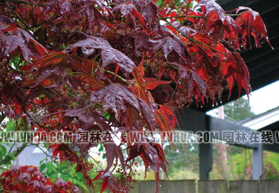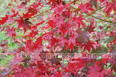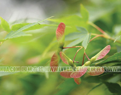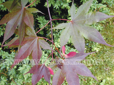 形態:落葉小喬木,高可達8-13米。樹冠扁圓形或傘形,樹皮平滑,灰褐色。枝開張,小枝細長,光滑。單葉對生,葉掌狀5~9深裂,徑5~10cm,基部近楔形或心形,裂片卵狀長橢圓形至披針形,先端銳尖,緣有重鋸齒,嫩葉兩面密生柔毛,后葉表面光滑,背面脈腋有白簇毛。花雜性,花紫色,徑6~8mm,萼背有白色長柔毛;傘房花序頂生,無毛。翅果平滑,無毛,兩翅展開成鈍角;ㄆ5月;果10月成熟,棕黃色。 分布:原產日本;我國長江流域各省,山東、河南、浙江有栽培。廣泛的運用于園林綠化中。 習性:弱陽性,耐半蔭,在陽光直射處孤植夏季易遭日灼之害;喜溫暖濕潤氣候及肥沃、濕潤而排水良好之土壤,在陽光曝曬及潮風影響的地方,生長不良,在高大樹木庇蔭下長勢良好。耐寒性不強,北方地區需小氣候良好條件下并加以保護才能越冬;酸性、中性及石灰質土均能適應。生長速度中等偏慢。對二氧化硫和煙塵抗性較強。 觀賞特性及園林用途:雞爪槭樹姿婆娑,葉形秀麗,且有多種園藝品種,有些常年紅色,有些平時為綠色,但入秋葉色變紅色,色艷如花,燦爛如霞,均為優良的觀葉樹種。無論栽植何處,無不引人人勝。植于草坪、土丘、溪邊、池畔,或墻隅、亭廊、山石間點綴,均十分得體,若以常綠樹或白粉墻作背景,尤美麗多姿。制成盆景或盆栽用于室內美化也極雅致。 紅楓(紫葉雞爪槭、紅槭)——槭樹科槭樹屬 紅楓是槭樹科雞爪槭的園藝變種。
