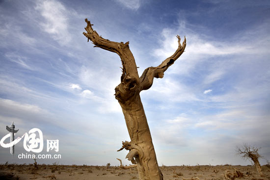 離額濟納黑水城不遠的地方,有一大片枯死的胡楊林,當地人也叫它怪樹林。遠遠看去像一個“陳尸遍野”的古戰場,千姿百態的形狀向現代人訴說著那場慘烈的惡戰——或低下身子,把一腔的熱血和淚水灑向大地;或伸出雙臂直向蒼穹,發出振聾發聵的吼聲;或將枝條你纏我繞,表露出難以割舍的親情…… 然而,造成胡楊樹枯死的真實原因,是地下水位的下降和氣候變化。胡楊林因缺水干旱而枯死,原本挺拔茂盛的胡楊樹才變成一棵棵怪樹。因此,置身怪樹林時,每個人不僅僅只有視覺的震撼,還有心靈的震懾。眼前那一根根掙扎著伸出的枯樹枝,仿佛正在向人類發出求救的呼喊——為了地球,為了人類,請重視保護生態環境。