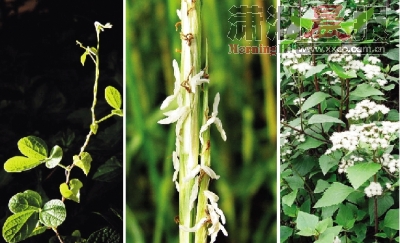 從左至右分別是纏在植物上的初生薇甘菊、大米、紫莖澤蘭