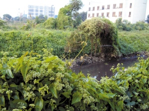 陳村海關(guān)背后的荒地,薇甘菊覆蓋整片土地,一棵柏樹被壓彎腰,另一棵則已枯死。