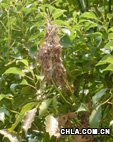 5 綴葉:有些種類的園林害蟲有綴葉為害的習性。常見的綴葉為害的害蟲有樟叢螟(又名栗葉瘤叢螟)和楓香叢螟。這類害蟲常幾條或幾十條群集為害,并能吐絲綴葉,所以在外觀上可見嫩枝和葉片結織成蟲巢的現象。