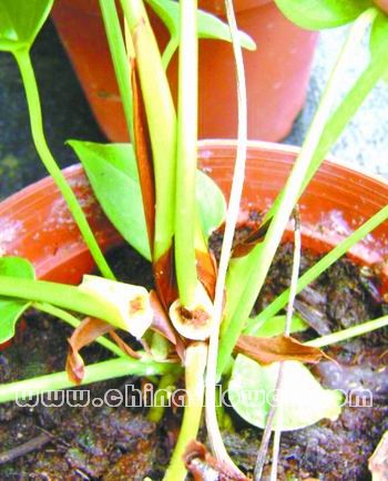5.藥劑防治:可用阿米西達(dá)3000至5000倍或卉友(Medallion)4000至5000倍,噻菌靈或多菌靈500至600倍液于種植扦插苗前處理根系及莖基部。在定植、移苗或換盆后使用阿米西達(dá)3000至5000倍或卉友(Medallion)4000至5000倍灌根處理一次。在植株?duì)I養(yǎng)生長(zhǎng)的中后期每隔14至21天使用阿米西達(dá)3000至5000倍和卉友(Medallion)4000至5000倍輪換灌根2至3次,即可有效地防除鐮刀菌枯萎病的危害。
