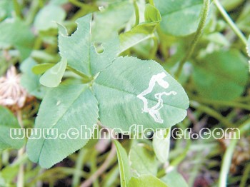 斑潛蠅屬雙翅目潛蠅科,國內分布較廣。為害特點:成蟲、幼蟲均可為害,雌成蟲把白三的葉片刺傷,進行取食和產卵。幼蟲潛入葉片的上下表皮之間吃食葉肉,只留上下表皮,使其葉片正面產生不規則蛇形白色蟲道。葉片葉綠素被破壞,影響光合作用,受害嚴重時全葉枯萎甚至葉片脫落,從而使白三葉的葉片失去觀賞價值。另外,斑潛蠅還能傳播多種植物病毒病。