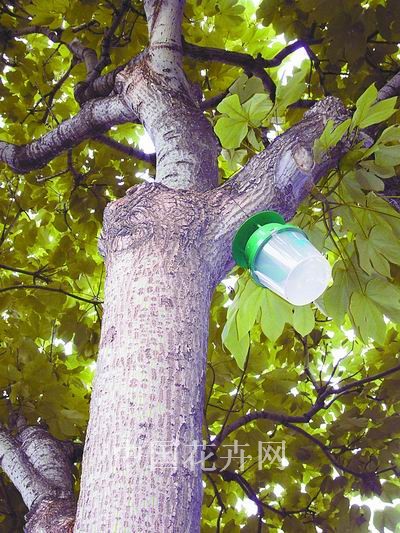 為保護園區環境,同時有效防止美國白蛾、斜紋夜蛾等害蟲對樹的危害,北京中山公園在園區內統一安裝了新一代誘蟲武器———美觀實用的桶型誘捕器。該型誘捕器分下桶和上桶,其內安裝的誘芯為性誘劑,固定在上桶內口1厘米處,下桶內置洗衣粉水,當蟲體被誘捕入桶后,下桶內的洗衣粉水可將蟲殺死,從而達到防治的目的。