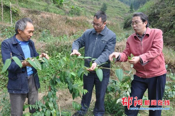 圖為副鄉長李傳和(右)、農業站站長歐陽明清(中)正在給金銀花種植大戶廖國友傳授病蟲害防治技術