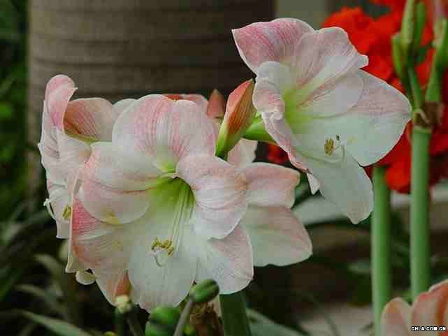 生態習性 朱頂紅別名百枝蓮、孤挺花、百子蓮、對紅等。石蒜科孤挺花屬。多年生草本植物,鱗莖大,球形,葉6-8枚,寬帶狀;傘形花序,花莛中空,花3-6朵,長12-18厘米,花被漏斗狀,紅色,心及緣上有白條紋,筒部長2.5厘米,喉部有不明顯的副花冠,6裂,倒卵形,蒴果球形,3瓣開裂,種子扁平。原產南美,半陰生,稍耐寒,喜排水良好的砂質壤土。 繁殖與栽培 1.蟹殖朱頂紅用分球、播種、切鱗莖和組織培養等法繁殖。分球,是將大球周圍著生的小的莖剝下另行栽種。開花時,可進行人工授粉,使其結種子。種子采收后,立即播種,約1周后發芽。苗期可移植:次,地栽3一4年開花。也可將一個大鱗莖切成8一16塊,每塊基部需帶有部分鱗莖盤,晾至英蔫后插入濕潤砂土中,即可生出小鱗墓,經分離栽培后,可以成苗。用Ms或whlte培養基,以花桓、子房作外植體進行組織培養,3-4個月后可形成不定芽。 2.栽培朱頂紅可露地栽培,也可盆栽、無土栽培。露地栽培,在最低溫度-10℃的地區,冬天蓋以召蓋物,也可越冬。2-3月問,將前一年收藏的大鱗莖進行整理,把主球四周的小鱗莖全剝下進行繁殖。將主球的殘根修掉,在陽光下曬兩天,待傷口干燥后即可栽種。栽墻地要地勢高燥,排水良好。株行距為15×30厘米。溝深約20厘米,在溝中填人10厘米厚的疏松肥沃脅腐殖土,然后再益薄土,使球的頂部矚出上面。栽桓后最好立即用塑料膜召蓋,以提高地溫,加速生根。在生長期,耍隨著葉片的生長,不斷增施肥料,每半月施1次。作切花的,要在花蕾含苞待放時,從花梗基部剪下。采花之后繼續供水供肥,但要減血施氮肥,增施磷、鉀肥,使的莖健壯充實。秋辰或冬初,應停肥。停水,使其逐步休眠。挖珍要選晴天,在土干時挖起。剪去葉片,除去泥土,咯加干燥后貯戌。室溫保菏5-10℃,室內空氣要流通干燥,以防止球根腐爛。對不開花的小球,在霜凍期應蓋以覆蓋物防寒。盆栽,要選用在田間生長3年購大球(直徑在7厘米以上),1個球植1盆的,用大于球徑2倍的盆,3-4個球集栽于1盆的,用25-30厘米的盆。要用排水好、富含腐值質的培養土,并加一些骨粉或過磷酸鈣作基肥。種前,先剝下球邊的子球,要淺植,使球的1/3-1/2居于土面上,上盆后澆水1次,使土略微潮潤即可,待發出新葉后再澆水。每半月施液肥1次。秋季停止澆水,剪去葉片,貯藏暖處使之休眠。待2-3月間,蔭芽后,予以翻盆或更換新土。
