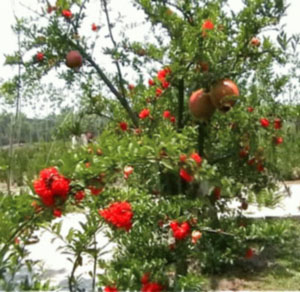 1) 選址:牡丹花石榴根系發(fā)達(dá),須根多,適性強(qiáng),對(duì)土壤要求不嚴(yán),在pH值4.5-8.2的土壤上均能正常生長(zhǎng),且耐鹽力強(qiáng)。南方地區(qū)栽種應(yīng)選在地下水位不低于1m的地方,低洼地塊建園時(shí),要深挖排水溝,實(shí)行高畦栽培。沙石灘地、丘陵坡地和平原等均可建園。