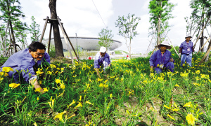 世博園區的綠化由本市近十家綠化單位派遣綠化工人進園管理、養護園林工人近三個月來,每天清晨6時就入園,在綠化帶上除施肥、澆水。他們辛勤的勞動,換來了世博園內的郁郁蔥蔥,如今綠地已成了世博游客休閑、小憩的好去處。
