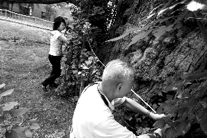 昨日,古樹專家徐公天(右)在測量古銀杏樹的直徑。經過專家“把脈”,這棵高齡古樹得以“對癥下藥”。 在密云巨各莊鄉塘子小學舊址,生長著一棵1300多歲的“北京銀杏王”,在北京銀杏樹樹齡排行中,名列第二。盡管當地盡心養護,但銀杏樹的一半枝干仍舊日漸干枯。昨日,中國古樹復壯專家現場為患病銀杏“把脈”,并“開方”醫樹。 據史料記載,這株“北京銀杏王”種植于唐朝,其所在地為唐代香巖寺遺址!度障屡f聞考》中記載:香巖寺內有鴨腳子(即銀杏樹)一株,又名白果寺。附近鄉民歷來視這棵古銀杏樹為“神樹”,向其祈求吉祥昌瑞。 然而,據村民反映,銀杏樹從2003年就開始出現枯萎的癥狀,并且情況日益嚴重。 “我們也著急,想知道用什么方法才能把它保護下來。”密云縣園林綠化局林政科科長彭連興稱,他們定期為古樹澆水、施肥,督促銀杏樹管護責任單位做好養護工作,還為銀杏樹增設護欄和灌溉設施,制定搶救復壯方案。 昨日上午,中國古樹復壯專家網首席專家、北京市園林綠化局綠地管理顧問徐公天受邀,趕到密云為這棵患病銀杏王“把脈”。 “你們"下錯藥"了!闭驹诠陪y杏樹所在的院子里,徐公天很是著急。他指出,古樹的養護,因樹種而異。銀杏樹的根對空氣水分的要求比普通樹根要嚴格,怕澇又怕旱,不能隨意灌溉,而人為給它加高土層,則導致土壤密實、內部空氣稀少、溫度低于周邊,造成了中間根部的窒息。 昨日,徐公天就施肥、修剪、整土、支撐側枝等4個方面,為銀杏樹開出了“藥方”,希望養護單位“對癥下藥”。 【現場】 望遠鏡放大鏡都成“診療器” 昨日上午,記者親見了這棵被視為“神樹”的古銀杏樹,其樹干直徑約3.5米,樹冠至地面足有20多米。樹上至少有一半側枝枯萎。 觀察銀杏樹后,徐公天指出,在自然生長狀態下,銀杏應當是主干直立,側干開張。但這棵銀杏在“年輕時”曾被修剪,導致現在發育成了沒有主干、側干叢生的形態。 掏出望遠鏡,徐公天看向干枯的樹冠!坝械牡胤綉搫偢煽莶痪,還能看到芽孢!毙旃鞆你y杏干枯的部位判定,中間的根已經死了。 摘下一片鮮嫩的銀杏葉,徐公天又掏出了放大鏡仔細端詳。“外圍葉子長得不錯,沒有出現黃斑等!毙旃炫卸,銀杏樹幾乎沒有遭受病蟲害,也非周圍環境導致干枯。 隨后,徐公天掏出小卷尺,在他人配合下,為銀杏樹測量了周長和直徑,分別為10.5米和3.5米。他還特意指出,不要堵住樹身上的樹洞,否則會導致雨水只進不出。 “還沒有到瀕臨死亡的地步,有救。”徐公天稱,銀杏樹生長的地方生態環境穩定,外界干擾少,只要養護得當,還能繼續開枝散葉。 【處方】 多管齊下為古樹保命 將堆高的土層推掉,只保留中間稍高于四周的地形,使水可以流向四周健康的側根。另外,以樹冠邊緣垂直于地面的滴水線位置為界,將護欄后撤到該范圍以外。 選擇在距離樹干一定距離的地方向外施肥,避免肥料聚集在樹干的根部。建議使用洛陽鏟,在距離樹干一定位置的范圍內,每隔七八十厘米打一個孔,孔深約60至70厘米,再往孔內加腐殖質,為側根加肥。 撤掉灌溉系統,讓銀杏樹吸收天然雨水。 修剪萌生條,避免大量萌生條搶走銀杏主體部分的養分。并保留2至3根比較粗壯的萌生條“留種”。