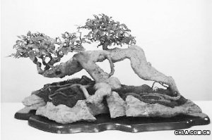 每當獲取一塊好石頭,他就琢磨如何與樹組成完美的整體,在構圖立意上進行空間設想、精心設計,從而使作品獲得藝術神韻。比如,怪石和樹構成畫面的不平衡,創造出奇險的佳作,往往給人以強烈的視覺沖擊力,震撼之余感到一種高貴典雅、自然清奇的文化氣息。