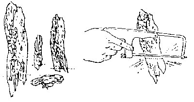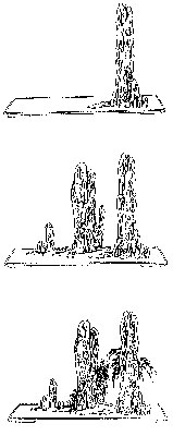 魚鱗石有青綠、青灰、棕黃、土紅或多色的五彩色。石內夾有大、小不等的白色礫石,若經風化脫落,則形成大、小不同的孔;也有風化成溝條骨架狀,形態瘦長似筍,故也稱石筍石。魚鱗石石質堅硬,重而脆,不吸水。因其石形有峻險、嶙峋之態,常用于制作峽谷式、峭崖式、險峰式及石林景觀。峰石多以自然成型,山峰不需修飾。選石劃線、鋸截后,磨平底部(圖1)。主峰定位后,配置山腳,再立配峰,形成峽谷、峭崖、險峰等景象(圖2)。布局時,在預留的石隙間進行填土,種樹綠化,并點綴配件。