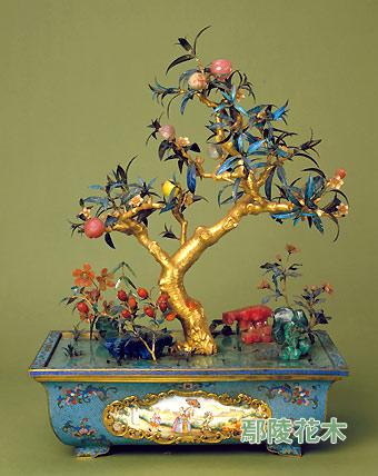 鑲寶石九重春色圖盆景,清乾隆,造辦處造,通高50.5cm,盆高12.6cm,盆徑40.3-25.7cm,足徑24-11cm。清宮舊藏。掐絲琺瑯長方形盆,盆壁以湖藍色釉鋪地,四面中央為銅鍍金鏨花沿開光,內嵌彩繪西洋人物景致的畫琺瑯片,開光外上下和四角掐絲花卉紋。盆中以玻璃鋪地,上植花草樹石。主景為桃樹,銅鍍金枝干,點翠,金蕊染牙花,桃實則以碧璽、芙蓉石、玉、黃料等多種玉石制成。樹下周圍襯有孔雀石、芙蓉石、染石山子以及用芙蓉石、瑪瑙、香瓣制作的小石榴樹和什錦花。此件盆景工藝精湛,意態生動,設景主次分明,錯落有致。鍍金桃樹干顯現出一派富貴氣象,點翠桃葉上的金色葉脈和寶藍色光澤的翠羽至今鮮明亮麗,各類寶石制做的桃實玲瓏可愛。杜甫《奉和賈至舍人早朝大明宮》中有詩句:“午夜漏聲催曉箭,九重春色醉仙桃!贝颂覙渑杈凹丛⒃娭小熬胖卮荷敝,表現春光明媚、欣欣向榮的太平景象,桃與壽石配景又含祝壽之意,這是清代南方盆景廣泛采用的一種式樣。此盆景為清乾隆年間不可多得的佳作。