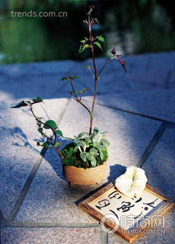 制作:在盆底先鋪上一層陶石,再放入泥土,種上紫蘇并固定,之后在旁邊種上網紋草,最后鋪上苔蘚。