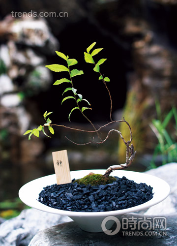 制作:在盆底先鋪上一層陶石,再放入泥土,種上駱駝榆并固定,最后鋪上苔蘚,撒上竹炭。