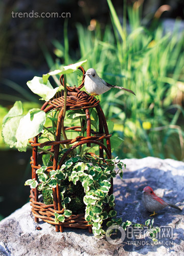 制作:往苔蘚球里栽種好常春藤和綠蘿,放置于鳥籠內(nèi),待其生長,枝會慢慢伸出鳥籠,索求陽光。
