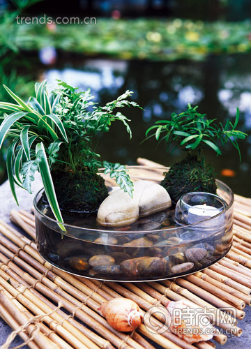 制作:在苔蘚球里栽種好銀邊草、鳳尾蕨和袖珍椰子,將苔蘚球放入透明的盆中,用石頭固定,再鋪上石子,注入水,點上玻璃小杯中的蠟燭,你的庭院在夜里也不寂寞。