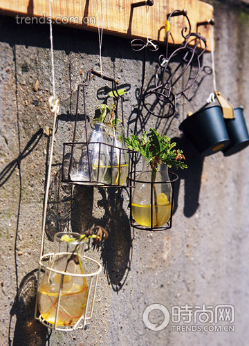 制作:用鐵絲為玻璃瓶制作一層“外衣”以承托玻璃瓶,掛在釘牢的小木板上,再掛上小花盆,增添花園氣氛。往玻璃瓶中隨意插入幾枝綠葉或者鮮花,景致即出。