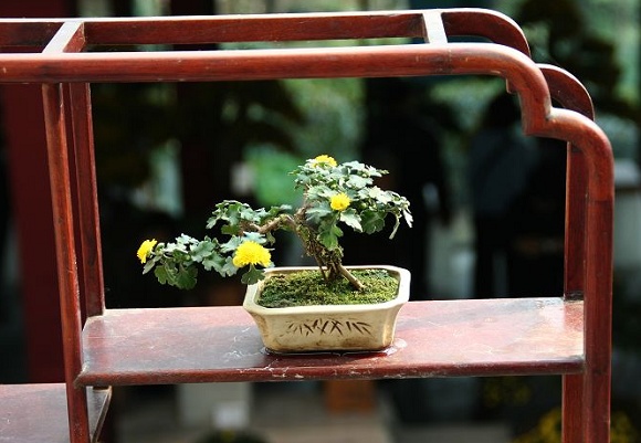 制作菊石圖盆景:選擇長方形或橢圓形的紫砂盆,將菊花栽植一側或兩側,但不要栽在花盆的中間,配上合適的山石,其形式如同國畫中的“菊石圖”。