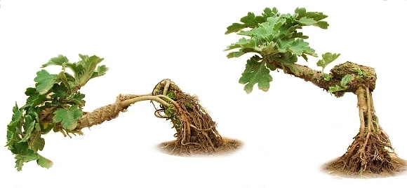 制作附木式菊花盆景:應選擇蒼勁古樸的枯樹樁,在樹木的后面鑿出寬度在2~3cm左右的溝槽,初夏將植株從瓦盆中扣出,把枝干放在枯樹樁背面已鑿好的溝槽中,用鐵絲或繩子加以固定,再栽入較大的瓦盆中養護,到秋季將它們移入紫砂盆。樹樁的枯朽斑駁,蒼古奇特和菊花的細小相互襯托,以菊花的花繁茂襯托枯老樹樁。