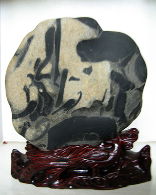 該黃河石的構圖奇異獨特,抽象意趣濃厚,宛如畢加索的一幅充滿哲理的抽象畫。整個畫面只用兩種顏色描繪,然而,它內中所體現的內容卻異常的豐富和精彩。造物主把人的面部進行極度的夸張和渲染,尤其是鼻子和眼睛被任意的拉長,并使之貫穿石面的上半部。而飛禽和走獸則被安置在人臉的下部,幾乎成為人臉的一個組成部分,好像在有意提示世人:“人”就是自然物體構造而成。這樣,一幅人與自然和諧統一的景象就立刻展現在人們的面前。人與動物如此親密接觸的畫面體現在奇石上,讓觀賞者感到無比的驚嘆!它似乎在告訴人們:人與地球上的一切生物雖然不是同類,但彼此之間息息相關。這種警示性的畫面以前出自畢加索之手,而如今則展現在奇石上,不能不讓人感慨上天的神奇和偉大。