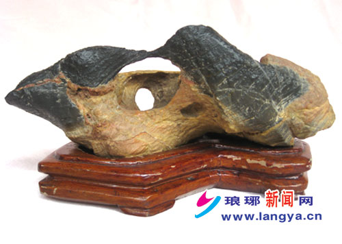 記者今日在張先生家看到了這枚奇石,只見奇石上部分有兩只惟妙惟肖的小鳥,小鳥頭下部和后邊還有一個鳥巢。奇石的材質為我國四大名石之一的靈璧石,石頭上方鳥部為黑色靈璧石,鳥窩部分則是黃靈璧石,奇石表面紋理變化有致,形態空靈,極具神韻。據張先生介紹,象這樣兩種顏色的同一石種天然在一起表現同一內容的靈璧石十分罕見,它完全符合奇石上品“皺、皴、瘦、透”的四要素,當屬靈璧石種的精品。
