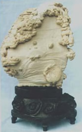 云錦石的抽象美是指那些表象特征沒有特定的可比擬物,又反映某一主題的石品具有的含蓄深邃之美。有一方題為“史記”的抽象云錦石于2000年曾參展于武漢全國花卉博覽交易會。該石為長卵形,略顯方體輪廓,整體抽象,但其周身酷似象牙的低浮雕圖紋,古色古香,充溢動勢。一幅幅重疊交錯的神秘圖景中仿佛涌動著許多史事,不禁使人聯想起《史記》中所描繪的那些久已塵封的、驚心動魄的政治風云與波瀾壯闊的古戰場,具有深沉的歷史滄桑感和濃重的時空雄渾美,令觀者自然而然發思古之幽情。