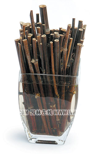 繁麗與簡雅,是插花藝術的兩種表現形式,各有各的美麗,并無高下之分。但對家庭日常插花來說,簡單又雅致顯然更易為大多數人所接受。因為對花藝的“門外漢”來說,只有簡單了,才能讓他們跨進花藝之門,而不僅只停留在欣賞階段。 此款花藝特別適宜春季家庭的裝飾,取材容易,還特別環保,無需使用任何花泥,枯枝就是最好的支撐物。幾支補血草、兩朵玫瑰、一束枯枝、幾把小豆芽(菜場均可買到)、一只玻璃瓶,雖然簡簡單單,卻自有一份雅致。補血草的紫配上玫瑰的淡橘紅;枯枝的深褐色配上小豆芽的嫩綠,想不迷人也難! 花材:短截的枯枝、補血草、玫瑰、小豆芽、玻璃瓶。 1。將枯枝截成等長的小段,填塞入玻璃瓶。