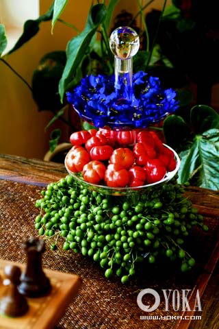 簡潔的背景 節日里賓客來訪、家人團聚用花藝裝點空間有很多化繁為簡的好辦法,重點是一些關鍵位置,花藝的擺放。像玄關處迎接賓客的效果,花材或花器就要結合玄關的材質與色調。如果環境留白太多,花材就應以細長高挑為主,像小倉蘭、水蔥、蝴蝶蘭、百合等。提高人們的視線,緩解過多的留白。尤其是深受東方影響的平行線造型,操作簡單,選材注意花莖筆直、干凈就好,效果非凡。 在客廳等安靜交流的空間里,花藝就不宜喧賓奪主,選擇淡雅、簡潔、枝形疏松一些的豐富空間,調節氣氛。在聚會時臨時需要一些獨立的小空間,也可以用軟裝飾結合花藝輕松實現空間分隔。一幅帷幔、一張條案,材質相同的花器,加上枝干疏密有致、造型自然的植材,就能起到很好的分隔效果。 花材:飛燕草南瓜茄苦苓子 花器:三層玻璃點心盤 利用點心盤的不同層次及可蓄水的特性將飛燕草一朵一朵拆下,用密集的方式插飾。 此設計主要為色彩的搭配與空間設計的結合。