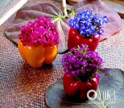 餐廳、游戲區等聚會氣氛熱烈的場所,就需要裝飾性強,能烘托氣氛的花藝設計了。不過,這里說的造型感強,并不需要高難的專業技巧,只要了解一些植材的特點,直接發揮就好。可能是幾片花葉、一兩個水果甚至一棵青菜! 造型感強,比如塊狀花材、傳統的球形很飽滿,都很有裝飾效果。除了色彩飽滿的花材,對比色調的設計營造氣氛也很熱烈,形式優美的綠葉配上大朵的牡丹,球形的西蘭花點綴紅色晶瑩的六倍利或櫻桃,布置餐桌或點綴茶點都很有效果。 還可以找些特異的花器,突出效果。用酒杯、用貝殼、用蛋糕烤盤、甚至就用花材、蔬菜自己!靈機隨現,都能使得賓主皆歡顏。 花材:六倍利 花器:彩椒(以蔬果為容器) 以彩椒為容器表現熱烈喜慶的氣氛。