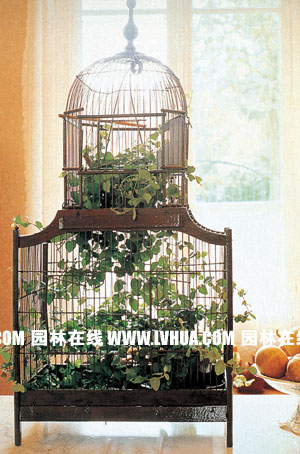 鳥籠藝術綠飾 鳥籠中是薜荔,能攀援、匍匐成下垂生長,所以在此構成了一幅活的籠中藝術畫。