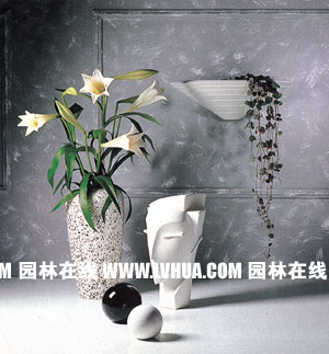 藝術綠飾的元素 具有強烈線條的植株需要以線條直硬、穩固感的容器匹配。如圖中的雕塑再次強調了百合花的線條,白色也是相諧的。吊金錢纖細下垂的線條花器的橫線紋及剪影對比舒宜。