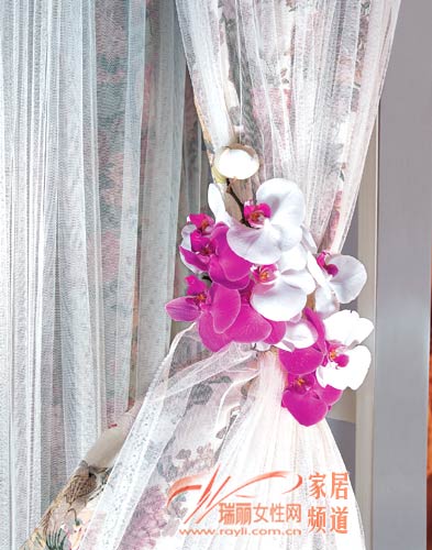 對于比較貴氣的窗簾來說,用紫色的艾麗絲花插在窗簾扣上,既可以與高貴的窗簾完美搭配,又能表現生活中的美好心緒。在被束起的窗簾上,插上幾朵艾麗絲,紫色花朵與金色的窗簾扣圍攏低調奢華的美感,讓略顯程式化的窗簾有了鮮活的表情。 制作方法:艾麗絲窗簾插花 直接將艾麗絲插入被束起的窗簾褶皺中,可以隨意插放,沒有太多講究。注意艾麗絲表達的是愛的過去式,有微微傷感的元素,所以忌諱與艷麗華貴色彩的窗簾搭配。 需要道具:蝴蝶蘭、艾麗絲、窗簾扣、花剪
