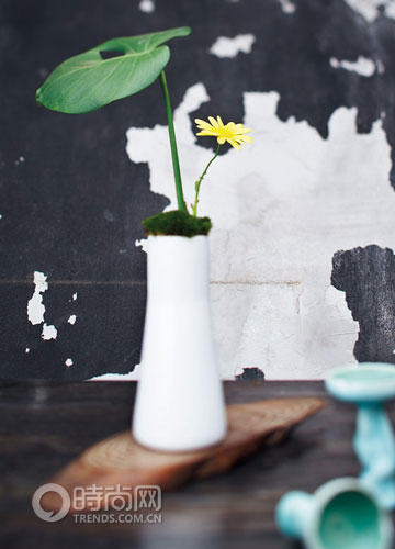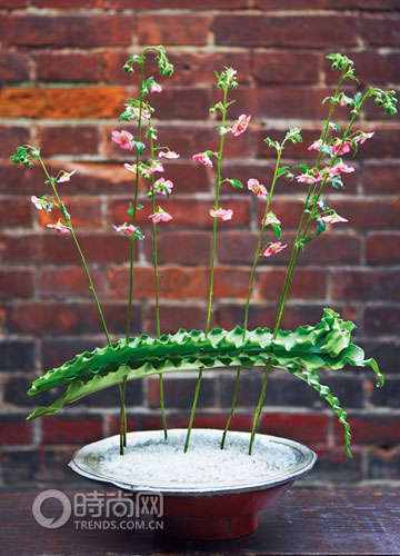 材料:蛾蝶花、鐵角蕨 花器:紅漆陶盆 對于多枝的同類花朵的插放,應注意保持彼此的疏離感。將蛾蝶花穿過鐵角蕨,插置于堆滿白色礫石的紅漆陶盆中。切面的角度中,蛾蝶花的枝條應為三角形,否則難以直立穩定。或者,將鐵角蕨之間的距離略微撥開,也有利于整體的平衡。可不是?風吹草間,粉蛾起舞。