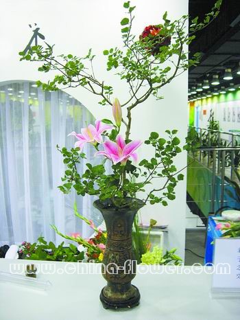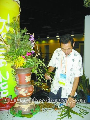 2008北京奧運會期間,包括港澳臺花藝師在內的18位中國花藝師在奧運主新聞中心(MPC),奉獻了一場場精彩的花藝表演,讓眾多國內外運動員和媒體工作者感受到了中國插花藝術的魅力。 參與此次表演的花藝師皆為中國傳統和現代插花的領軍人物,其中有來自祖國大陸的萬宏、孫煒、劉飛鳴、林志華和組合盆栽名師廉兵等,以及來自臺灣的王國忠、香港的周淑嫻和澳門的周佩華。 在活動期間,每逢單號日的下午,主新聞中心二層通往發布會會場的主通道上都有花藝表演。具有濃郁中國文化特色的花材、花器和花藝表現形式,常引得見多識廣的各國記者們嘖嘖稱奇,圍著表演臺連連拍照。還有一些愛好者忍不住上前與花藝師交流,語言溝通不暢時甚至都比劃上了。為了使大家能夠充分交流,周到的主辦方還安排了互動環節,讓觀眾在花藝師的指導下親手制作一些花籃、花瓶等簡單的作品,完成以后可以帶走。現場氣氛往往在互動環節達到高潮。 在奧運會的最后一天,花藝表演者是中國插花花藝協會副會長羅寧和中國科學院北京植物園副主任劉政安。兩位花藝師身著傳統的棗紅色馬褂,一招一式之間流露出中國傳統插花的從容與淡定。羅寧的作品以古詩或古語為名:其中一件作品的主花材為高潔的竹子和出淤泥而不染的蓮花,作品名“君子之交”,插在盛滿清水的圓盆中,應了“君子之交淡如水”的說法。另一件作品名為“一片冰心”,整個作品以茶幾為底座,將一些簡單的花材插在一個茶壺和兩個茶杯中,對照了“一片冰心在玉壺”的古詩。劉政安在植物園就地取材,采用丁香、木瓜海棠等的樹枝做花材,并與傳統的瓶器結合,形象地表現出中國傳統插花獨特的韻味和意境。 羅寧和劉政安向記者介紹,在作品中他們還使用了不少中國傳統插花的技法和工具。如一種叫“撒”的技法,就是用各種形狀的樹枝卡在花器中,起到固定花材的作用;另外,兩位花藝師還展示了傳統的“劍山”———一個布滿“釘子”的底座,中國傳統插花都是將花材插在“劍山”上,雖然古代插花時沒有花泥,但是使用這種“撒”的技法和“劍山”進行插花,相比使用花泥一點都不遜色。通過兩位花藝師的花藝表演,這些傳統技法也得到了發揚和普及。 活動主辦方之一北京花協秘書長趙五一介紹:“半年前,我們就開始組織這些花藝師進行一周一次的培訓和交流。內容包括中國傳統插花技法及表現形式,我們希望通過這次花藝表演來展現中國文化。”