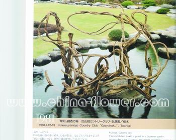記者:與流行的西式花藝相比,草月流花藝裝飾空間的效果有什么不同呢? 鄭巧雪:相比西式花藝,草月流在現代感的形式上,又多了東方插花的內在靈魂和意境美。西式花藝手工細致,用很多粘貼、架構的手法,視覺華麗,裝飾性強卻偏于表面化。草月流花藝則更自然,不用花泥,造型采用搭建的技巧,不大量用花,而是講究花材的線條美。重在表現創作者的個性和思想,很多時候更是以石頭、枯枝等為主材。其豐富的內涵和強大的張力可以提升空間的品味,令觀者產生對生命和美的思索。比如在公園水景的裝飾中,用干枯的藤和石頭組合造型(如圖3),表現歷史的悠遠和生命的厚重,大氣磅礴,蕩氣回腸。