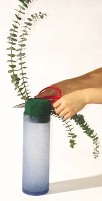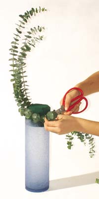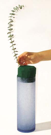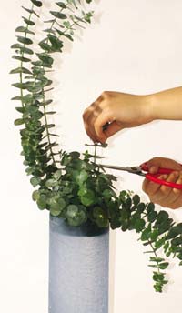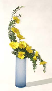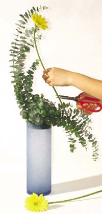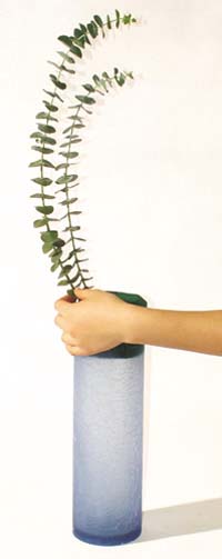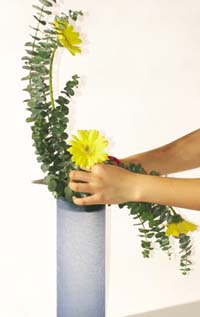 s形的插花是因其造型與英文字母s相似而命名的,其來源可追溯到18世紀(jì)的畫家威廉·霍卡斯,他對自然界中那些彎彎曲曲的線產(chǎn)生濃厚興趣,并在許多作品中采用了優(yōu)美的s形曲線題材。s是由一個正向與一個反向的兩個弧度相連接而成。當(dāng)然,插花不是簡單的劃線,需要將花體由狹至寬、再由寬至狹地表現(xiàn)。 準(zhǔn)備好花材:線型花材優(yōu)加利、黃色扶郎(非洲菊) step1花器適宜選高瓶,從視覺效果要求來說,用窄又深的高瓶,效果更佳。把泡制好的花泥切成與瓶口大小相適,用塑料紙包好鑲?cè)牖ㄆ恐小形插花采用的花材以帶有曲線狀的最好。 這樣,一個作品就完成了,s形插花顯得簡潔而又風(fēng)情萬種,流線型的整體感覺是裝飾客廳、臥室的理想插花。 《綠色家園》 (2004年 第十一期)