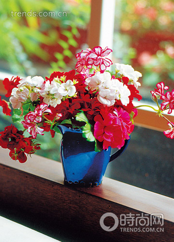 缺了口的杯子不能喝水但卻是插花的好容器,把來自陽臺盆栽采下的天竺葵放進去,不必刻意設計就自有一份美感。
