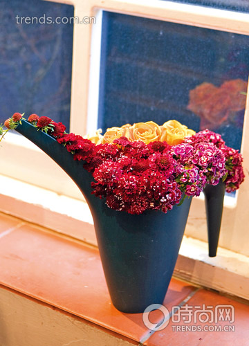 造型感強的澆水壺,本身就很吸引人,把色彩強烈的花朵依著壺的造型,成組放入壺內便是一個美麗的作品。