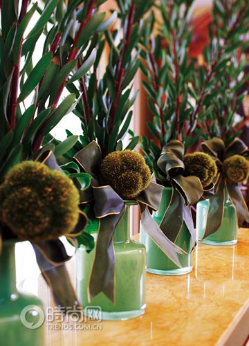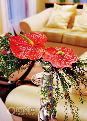客廳是節日家庭布置的重點區域,不要選擇太復雜的材料,花材持久性要高一點,不要太脆弱。客廳茶幾、邊桌、角幾、電視柜、壁爐等地方都可以設計花藝,在一些大位置的角落,如壁爐、沙發背幾后也可以設計。但要注意高度,客廳茶幾上的花藝不宜太高。