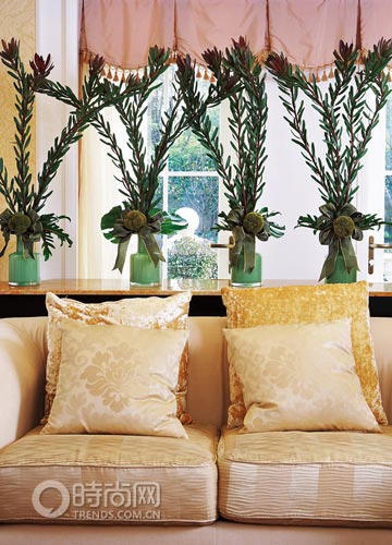 休閑室沙發后背幾的插花設計:選用樹狀放射的花材,產生透視間隔感,上面放射,下面花球部分凝聚力整合,實虛對比,更易體現花器的優雅。
