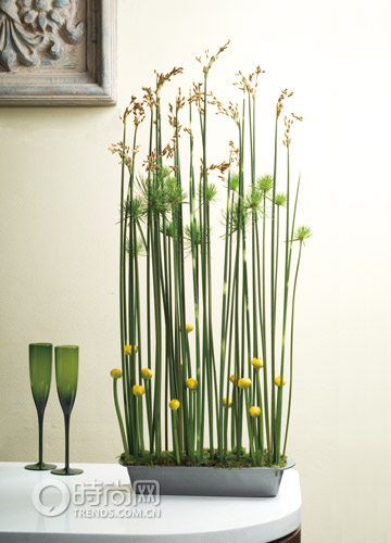 花材:太藺(水蔥)、小莎草、萍蓬草;花器:蛋糕烤盤。以平行線的排列方式將植物的線條美自然呈現(xiàn)