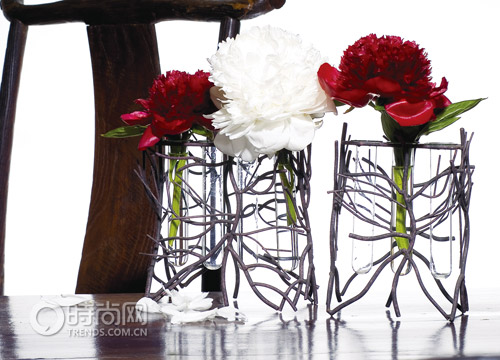 花材:芍藥;花器:樹枝狀鐵架。以塊狀芍藥與線條的花器對比。