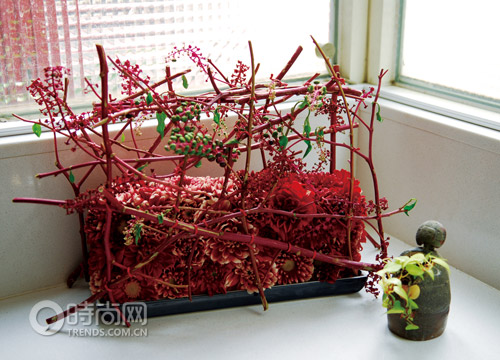 花材:大理花;花器:長方型淺碟。以洋商陸枝干架構(gòu)出外廓,充分利用樹枝表現(xiàn)結(jié)構(gòu)之美。