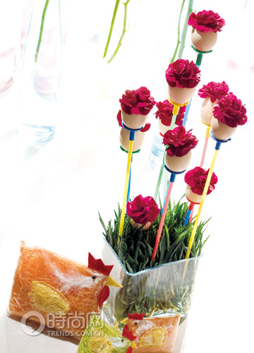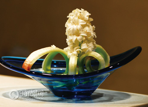 花材:風(fēng)信子、孤挺花梗;花器:藍(lán)色船型玻璃花器。將剩下的孤挺花梗再利用,先用刀片將花梗兩端劃開,再整個(gè)投入水中,泡一個(gè)小時(shí)之后花梗即會(huì)產(chǎn)生卷瓣?duì)畹膽騽⌒宰兓賹L(fēng)信子置入中空的花荃中,即是一盆簡單又富張力的作品。